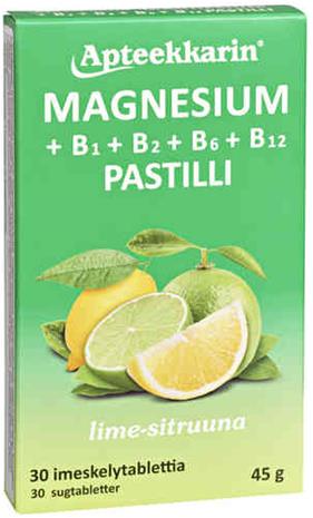 Apteekkarin Magnesium + B1, B2, B6, B12 pastilli 30 imeskelytablettia hintaan 4.44 €