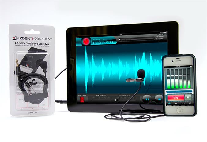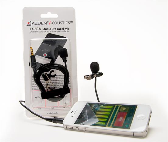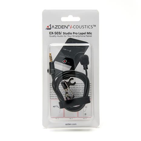 | Tuotekuvaus | Studio Pro Lapel Microphone for Smartphones & Tablets. The Azden® i-Coustics™ EX-503i is designed to give you studio quality sound with your smartphone or tablet. Just plug it into the microphone jack for clean, crisp audio. The EX-503i is perfect for easy, hands free recording of lectures, speeches, dictation, interviews and more. |