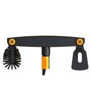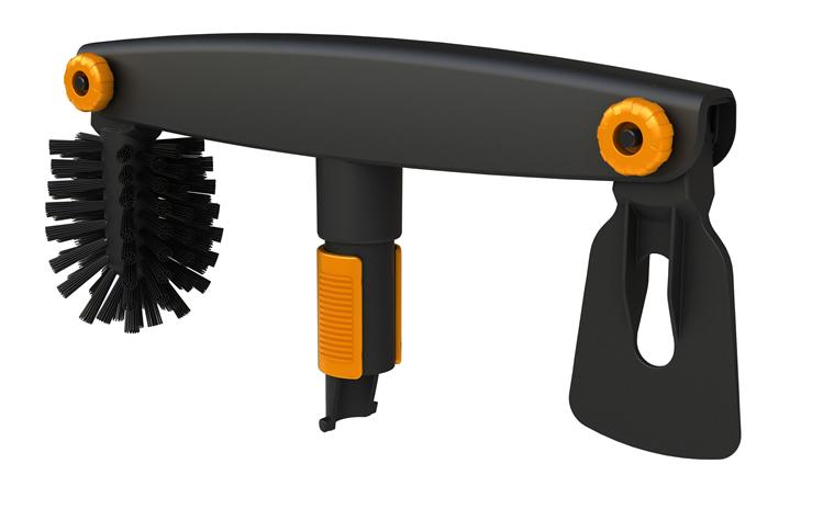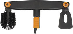 | Tuotekuvaus | Harjan ja raaputtimen yhdistelmä puhdistaa räystäskourut tehokkaasti. Optimaalinen työskentelykulma voidaan säätää molempiin päihin erikseen. Käytetään Fiskars QuikFit Teleskooppivarsien kanssa |