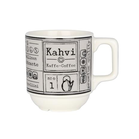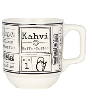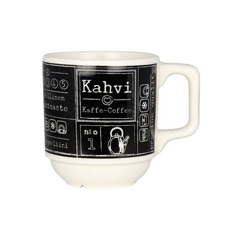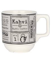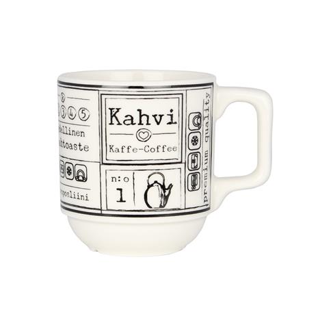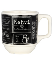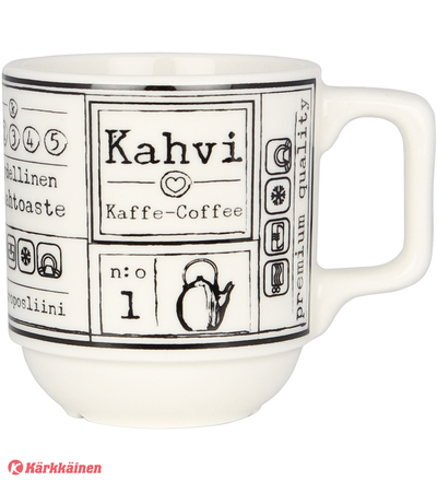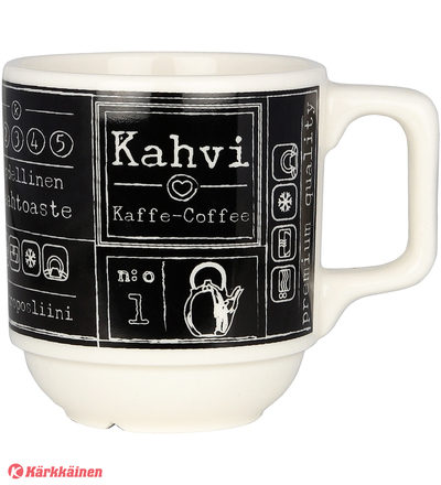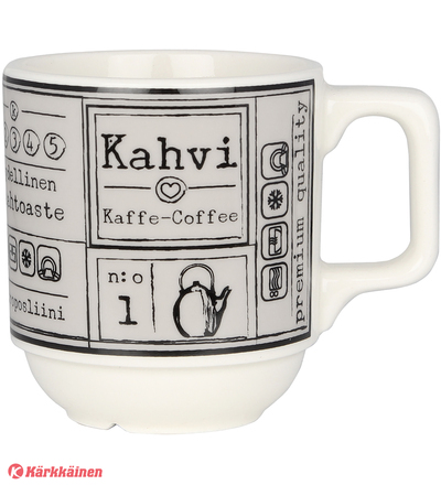 | Tuotekuvaus | Kultakeramiikan uusi pinoutuva kahvimuki-sarja on nimeltään Kahvilla. Reilu ja tukeva kahvikuppi tuo kahvilan tunnelmaa kotiin. Mustavalkoiset ja harmaat mukit valmistetaan korkealaatuisesta vitroposliinista ja kestävät konepesun, uunin, mikroaaltouunin ja pakastuksen. |