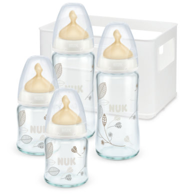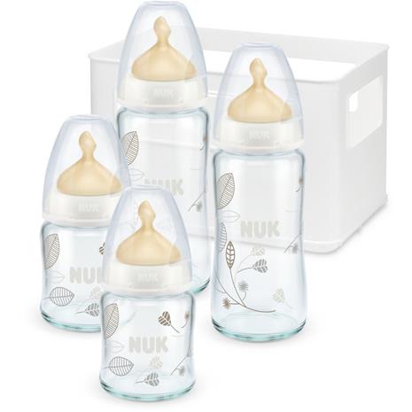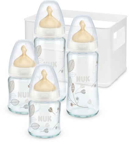 NUK, Aloituspakkaus, Lasiset tuttipullot lateksitutilla sis. tiskaustelineen, Valkoinen