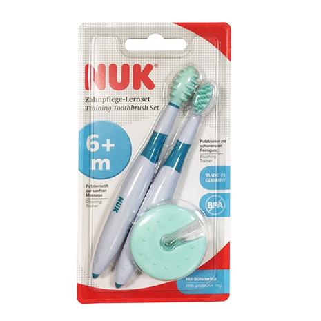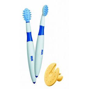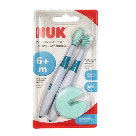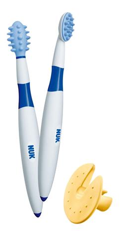 | Tuotekuvaus | NUK ensihammasharja sisältää suojarenkaan joka estää pientä lasta laittamasta hammasharjaa liian syvälle suuhun. Harjassa on nystyröitä jotka hierovat arkoja ikeniä ja rauhoittavat lasta. Harjassa on myös anti-slip varsi johon lapsen on helpompi tarttua. |