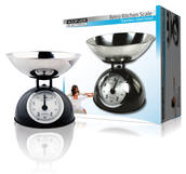Musta retrokeittiövaaka ja kulho ruostumatonta terästä