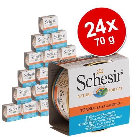 Schesir in Natural Gravy -säästöpakkaus 24 x 70 g - lajitelma: tonnikala & meribassi + tonnikala & kultaotsa-ahven hintaan 19.99 €