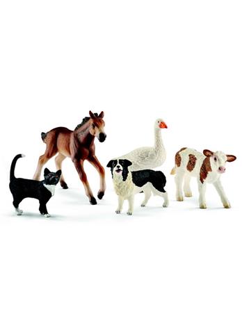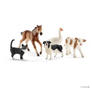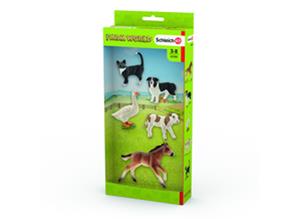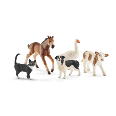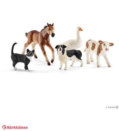 | Tuotekuvaus | Tämä sarja sisältää viisi maatilan eläintä: kirjavan vasikan, kissan, bordercollien, hanhen ja mustang-varsan. Maatilalla on syntynyt kirjava vasikka ja mustang-varsa. Ne seisovat vielä hieman huterasti mutta sipsuttelevat jo reippaasti pihalla. Hanhi tervehtii innokkaasti kaakattamalla ja bordercollie nuuhkii tulijoita iloisesti. Kissa puolestaan tarkkailee maatilan rauhallista elämää mukavasti aurinkoisesta mielipaikastaan. Kaikki Schleich-hahmot on muotoiltu yksityiskohtaisesti ja maalattu huolellisesti käsin. |