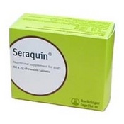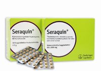 Seraquin makutabletit on koiralle tarkoitettu ravintolisä, joka ylläpitää nivelten toimintaa. Seraquin valmisteesta on kahta eri vahvuutta. Seraquin vet koiralle tabletit on tarkoitettu yli 10 kg painaville koirille. Seraquin makutabletit sisältävät terveen nivelruston rakennusaineita, kondroitiinisulfaattia ja glukosamiinia erittäin maistuvassa muodossa. Näiden lisäksi Seraquin sisältää kasvikunnan antioksidanttia eli kurkumauutetta. Koostumus: Inaktivoitu hiiva, jauhettu katkaravun kuori (glukosamiiniHCl) 500 mg, jauhettu porsaan henkitorvi (kondroitiinisulfaatti) 380 mg, glukoosi (rypälesokeri), sokeri, vakioitu kurkumauute 50 mg, maissivalkuainen, stabilointiaine (E470), glyseroli (E422). Annostus: koiralle yli 10 kg: 10 &ndash 20 kg 2 tablettia, 20 &ndash 40 kg 3 tablettia yli 40 kg 4 tablettia päivässä. Kun tabletteja on annosteltu 4-6 viikon ajan, voidaan annos vähitellen puolittaa |
