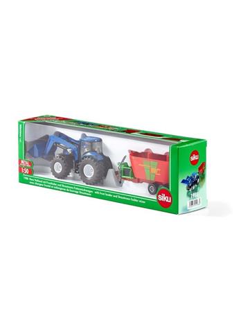 Siku 1988, New Holland -traktori, etukuormaaja ja Strautmann-seosrehuvaunu 1:50 hintaan 31.57 €