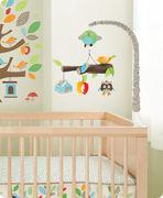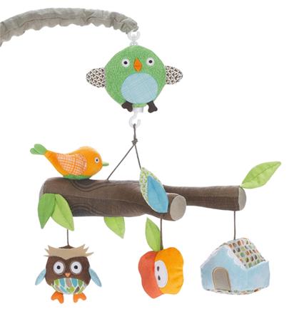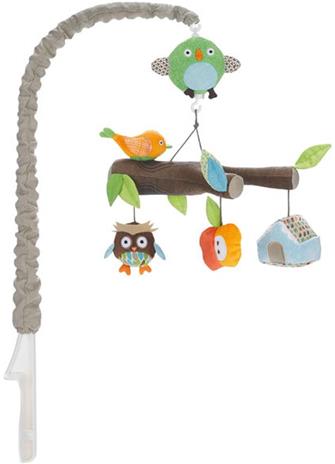 | Tuotekuvaus | Skiphop Treetop Friends mobilen kankaalla päällystetyt oksat ja herttaiset eläinystävät luovat satumaista tunnelmaa. Lehdillä koristeltu oksa pyörii hitaasti ympäri Brahmsin kehtolaulun soidessa ja lapsen huomio kiinnittyy mobilen kauniisiin yksityiskohtiin. Mobilessa on päälle/pois -nappi ja musiikki soi kerrallaan kuuden minuutin ajan. |