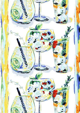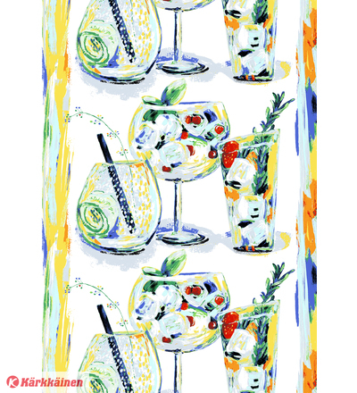 | Tuotekuvaus | Drinkki-vahakankaan kuosi luo kotiin oitis pirskahtelevaa juhlan tuntua. Kuosi on värikäs, kuplivan raikas, herkullinen ja kesäinen. Drinkkejä koristavat ja maustavat luonnon omat herkulliset antimet: tuoreet yrtit, punaiset marjat, kukat ja kurkunviipaleet. Lasissa voi olla vaikkapa klassikkoaineksista loihdittu lempijuoma tai kokeilevan maukas herkku-mocktail. Kevät tarjoaa monta mainiota syytä kohottaa malja iloisessa seurassa! |