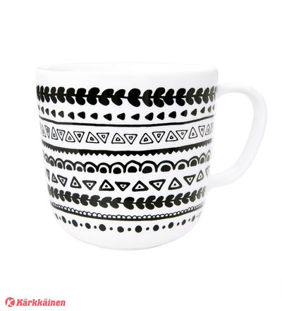 | Tuotekuvaus | Kerttu-mukin kuosi on saanut inspiraationsa kansallispukujen nauhojen taidokkaista koristeluista. Eveliina Netin suunnittelemassa Kerttu-mukissa on raitoja, jotka muodostuvat palloista, kolmioista, alaspäin olevista sydämistä ja kaarimaisista muodoista. Nimi, jota kuosi kantaa, Kerttu, on vanha naisen nimi. Vallilan uusi keraaminen Rehti-mukimalli on kaveriaan Muru-mukia sirompi ja muotoilultaan entistä sopivampi käteen kuin käteen. Myös mukin korvaa on hiottu entisestään, ja Rehti-mukin korvasta saakin todella napakan otteen! Mukin vetoisuus on 3 dl ja se pinoutuu kätevästi. Muki on mikron ja konepesun kestävä. |