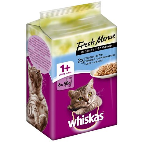 Whiskas Fresh Menue 6 x 50 g - vaaleaa kalaa, tonnikalaa, lohta kastikkeessa hintaan 1.89 €
