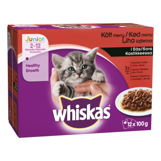 Whiskas Kissanruoka 12 x 100 g Junior lihalajitelma kastikkeessa